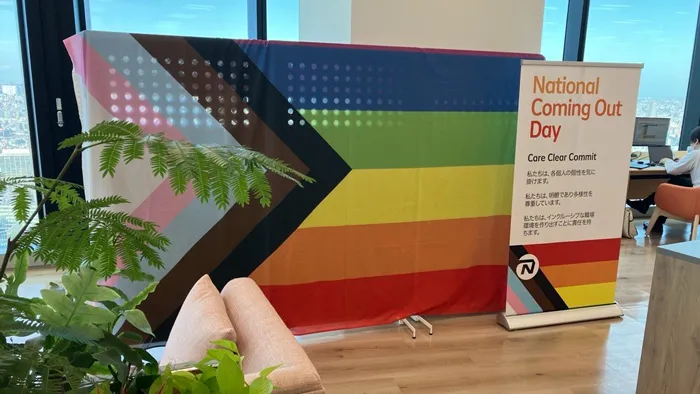 ナショナル・カミング・アウト・デーにあわせたプログラスプライドフラッグ 掲揚
