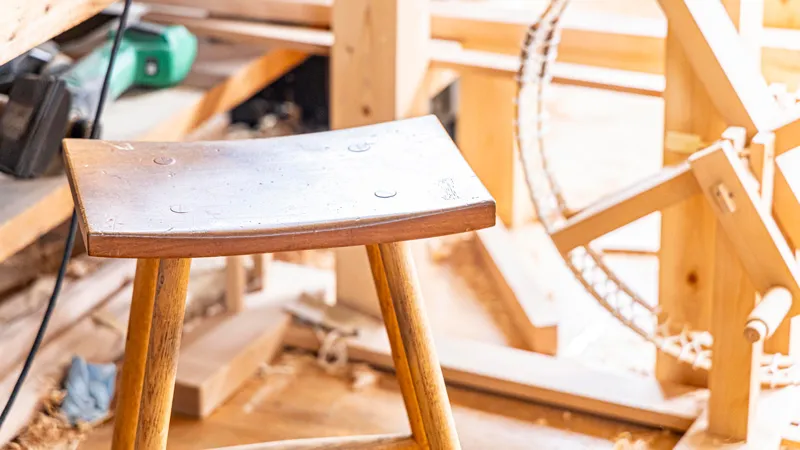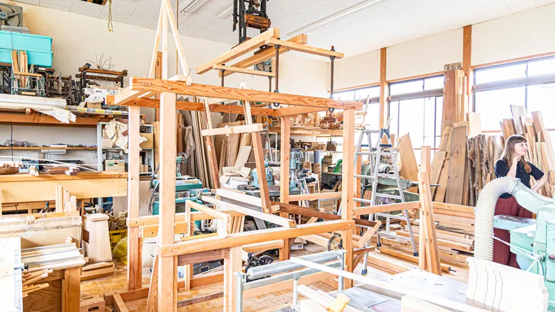 工房は外から見ると二階建てのよくある木造の家。しかし中はさまざまな織機か並ぶ。工業用ミシンやトルソーもある。さらにその奥に木工の工場まであった。今は六本木 東京シティビュー&森アーツセンターギャラリーで開催する、「CHANEL(シャネル)」の特別展示のため、織機を製作しているそうだ。