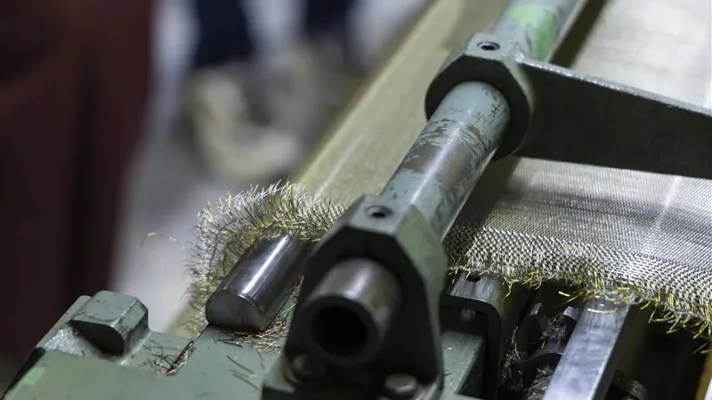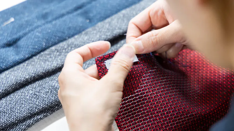 「KUSKA」は2010年から職人によるオールハンドメイドのネクタイにこだわると同時に、大胆な海外展開を行っている。イタリア・フィレンツェの見本市出店から始まり、現在はロンドンの老舗テーラー「HUNTSMAN」にもKUSKAのネクタイが並ぶ。小学校の体育館とほぼ同じ広さの工房に、20台の織機と織り上がった生地をプロダクトに加工する作業場が詰まっていた。ガシャンガシャンと明るく力強い音が工房を満たす。京都の伝統産業、西陣織の力織機を引き継ぎ、手を加え現在も使い続けているのだ。