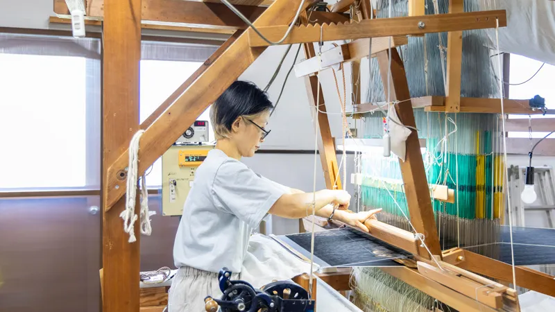 この工房を率いるのが、趣味のサーフィンをきっかけに地元に戻った楠泰彦氏だ。1936年に丹後ちりめん製造業として始まった家業を3代目として引き継いだ。楠氏は既存の流通のあり方を捉え直し、OEM中心だった生産体制から自社ブランドを直接届けるB to Cへ転換。それだけではなく、東京で勤めた建設会社での経験を活かし手織り機を自ら改造。さらに営業を学びながら海外展開も成すという、まさしくパワフルなマルチプレイヤーだ。