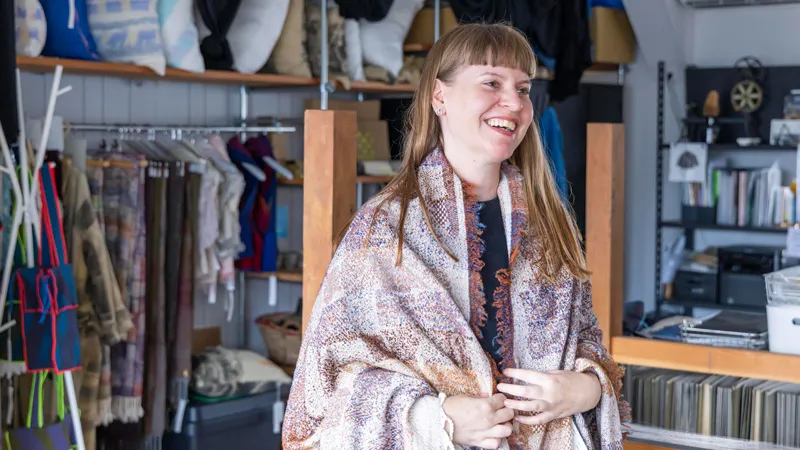 原田氏は芸大で彫刻を学び、ハウスメーカーに就職したのち2015年に与謝野町に移住。PARANOMADをスタートさせた。原田氏は彫刻家・名和晃平氏のスタジオ「SANDWICH」出身で、バックオフィスから作品製作まで多岐にわたる業務経験を活かし、ショップも兼ねる自身のスタジオを自ら改築した。日の光がたっぷり入るスタジオは丹後でありながら、ヨーロッパのアトリエを思わせる空気が漂う。木製の織機の周りに、雑多に積まれた荷物ですら原田氏の世界観を構成している。