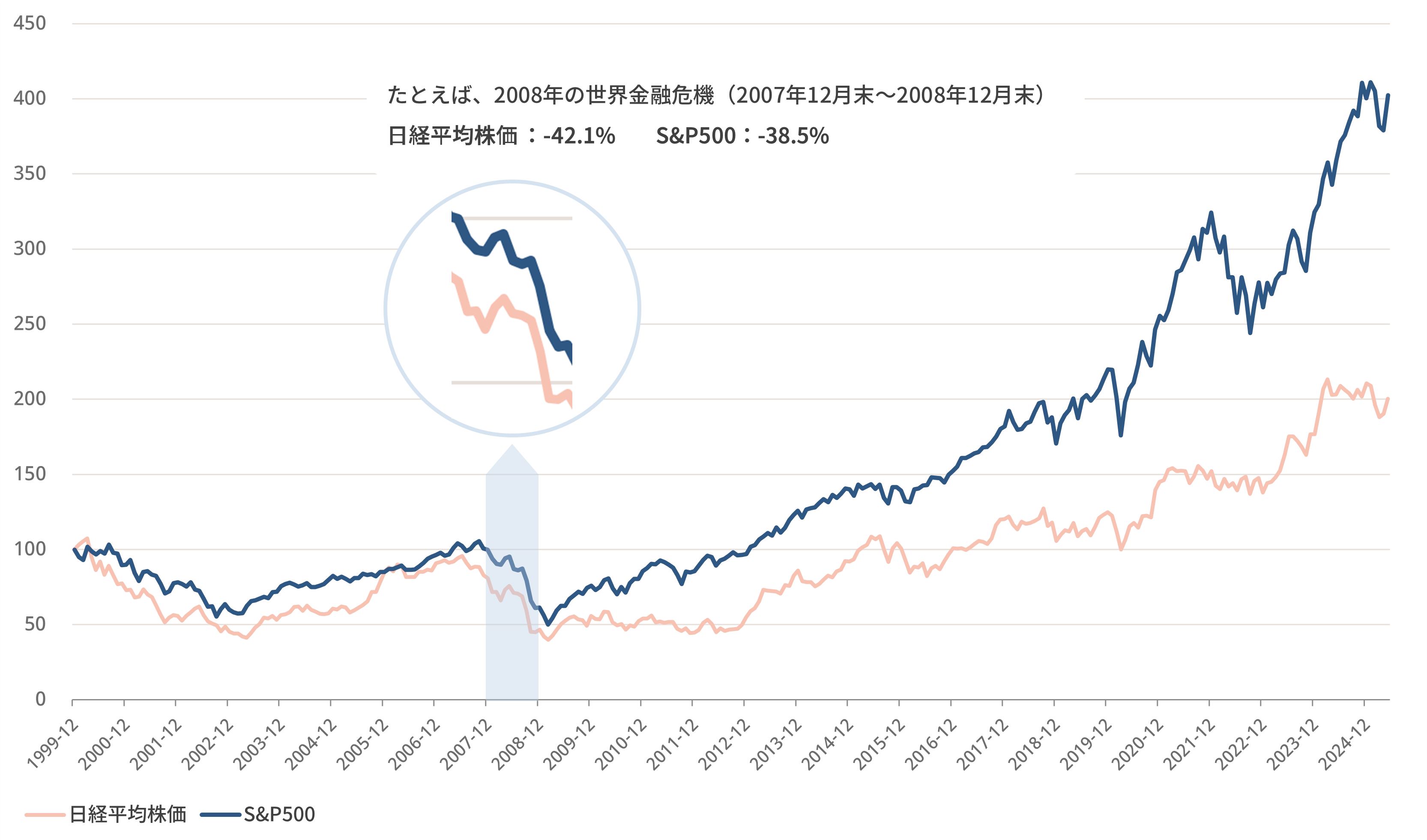 例えば2008年の世界金融危機の2007年12月末から2008年12月末までの値動きを見ると、日経平均で-42.1%、米国株の代表的な指標であるS&P500 では-38.5%でした。