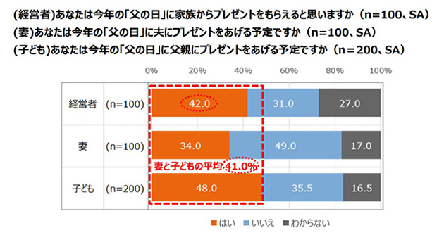 さらに、父親である中小企業経営者100名に、今年の「父の日」に家族からプレゼントをもらえると思うか聞いたところ、「はい」と回答したのは42.0%でした。「父の日」にプレゼントを贈る予定の妻と子どもの平均41.0%と比較すると、家族から「父の日」のプレゼントをもらえるという予測はほぼ当たっているようです。