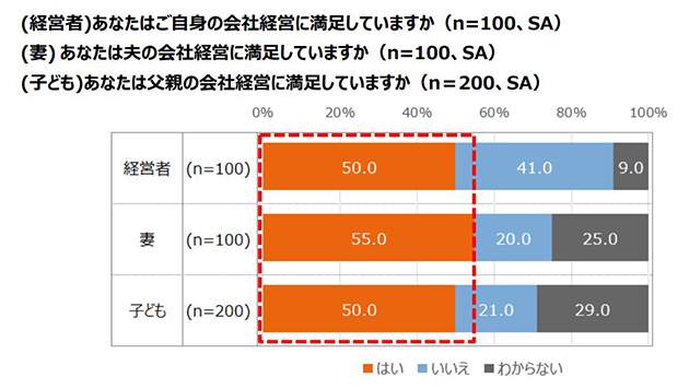 また、中小企業経営者の妻100名に、夫の会社経営に満足しているか聞いたところ、「はい」と回答したのは55%、中小企業経営者の子ども200名に、父親の会社経営に満足しているか聞いたところ、「はい」と回答したのは50%で、家族間においても、中小企業経営者である夫、父親の会社経営に半数は満足していることがわかりました。