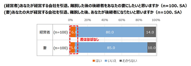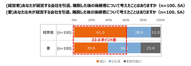 また、中小企業経営者の妻100名に、夫が経営する会社を引退、離脱した後の後継者について考えたことがあるか聞いたところ、「はい」と回答したのは39.0%で、夫婦間で22.0ポイントも差がありました。