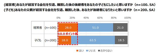 さらに、中小企業経営者100名に、後継者を自分の子どもにしたいと思うか聞いたところ、「はい」と回答したのは28%で、後継者を妻にしたいと思うかと聞いたところ、「はい」と回答したのはわずか6%でした。一方、中小企業経営者の子ども200名に、父親の経営する会社の後継者になりたいか聞いたところ、「はい」と回答したのは18%、中小企業経営者の妻100名に、夫の会社の後継者になりたいか聞いたところ、「はい」と回答したのは5%でした。