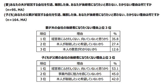 夫の会社の後継者になりたくない・わからないと回答した中小企業経営者の妻95名、父親の会社の後継者になりたくない・わからないと回答した中小企業経営者の子ども164名に、その理由を聞いたところ、いずれも「経営者にふさわしくない、向いていないと思うから」という理由が1位となりました。