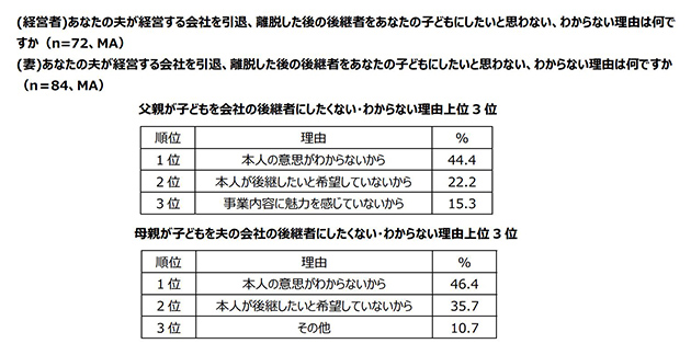 さらに、子どもを会社の後継者にしたいと思わない、わからないと回答した中小企業経営者72名、子どもを夫の会社の後継者にしたいと思わない、わからないと回答した中小企業経営者の妻84名に、その理由を聞いたところ、いずれも「本人の意思がわからないから」という理由が1位となりました。