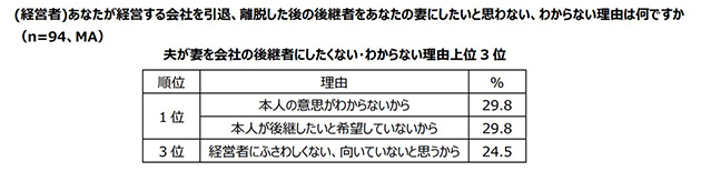 また、妻を会社の後継者にしたいと思わない、わからないと回答した中小企業経営者94名に、その理由を聞いたところ、「本人が後継したいと希望していないから」と同率で「本人の意思がわからないから」という理由が1位となりました。