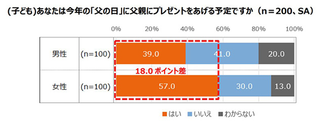子どもを男女別(各100名)でみると、「はい」と回答したのは男性39.0%に対して、女性は57.0%と男女で18.0ポイント差があり、女性の子どもの方が父親へ「父の日」のプレゼントを贈る傾向にあることがわかりました。