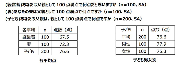 中小企業経営者100名に父親として100点満点で何点だと思うか聞いたところ、平均67.5点でした。同様に中小企業経営者の妻100名と中小企業経営者の子ども200名それぞれに、夫は父親として、父親は親として100点満点で何点だと思うか聞いたところ、妻の平均72.3点、子どもの平均76.6点と、中小企業経営者の自己評価よりも妻や子どもの評価が高いことがわかりました。
