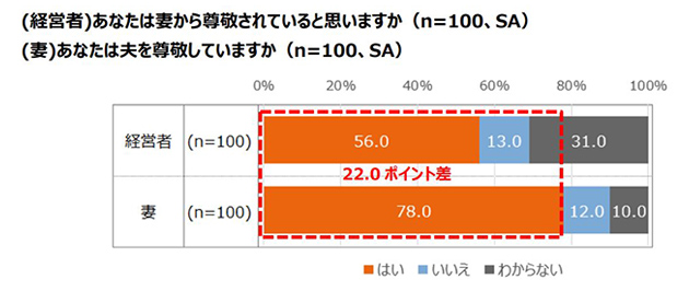 中小企業経営者の妻100名に、夫を尊敬しているか聞いたところ、「はい」と回答したのは78.0%であるのに対し、中小企業経営者100名に、妻から尊敬されていると思うか聞いたところ、「はい」と回答したのは56.0%と22.0ポイントも低いことがわかりました。