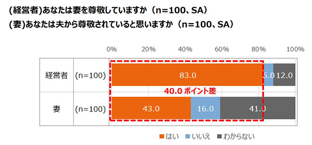 同様に、中小企業経営者100名に、妻を尊敬しているか聞いたところ、「はい」と回答したのは83.0%であるのに対し、中小企業経営者の妻100名に、夫から尊敬されていると思うか聞いたところ、「はい」と回答したのは43.0%と40ポイントも低いことがわかりました。