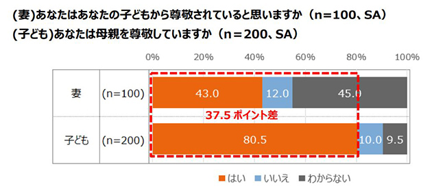 また、中小企業経営者の子ども200名に、母親を尊敬しているか聞いたところ、「はい」と回答したのは80.5%であるのに対し、中小企業経営者の妻100名に、子どもから尊敬されていると思うか聞いたところ、「はい」と回答したのは43.0%と37.5ポイント低い結果となりました。