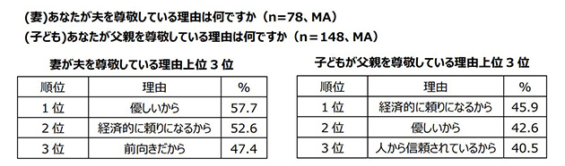 夫を尊敬していると回答した中小企業経営者の妻78名に、夫を尊敬している理由を聞いたところ、「優しいから」という理由が1位となりました。また、父親を尊敬していると回答した中小企業経営者の子ども148名に、父親を尊敬している理由を聞いたところ、「経済的に頼りになるから」という理由が1位となりました。