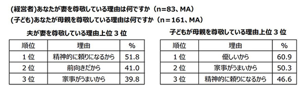 - 妻が中小企業経営者の夫を尊敬している理由1位は「優しいから」、子どもが中小企業経営者の父親を尊敬している理由1位は「経済的に頼りになるから」