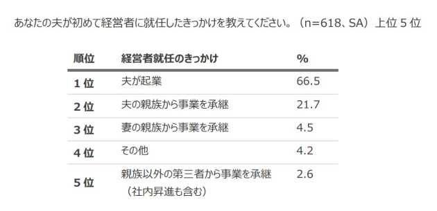 経営者の妻618名に、夫が経営者に就任したきっかけを聞いたところ、1位は「夫が起業」66.5%、次いで「夫の親族からの事業承継」21.7%、「妻の親からの事業承継」4.5%という結果でした。