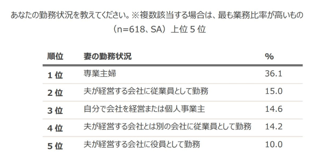 - 経営者の妻は、約4割(36.1%)が専業主婦