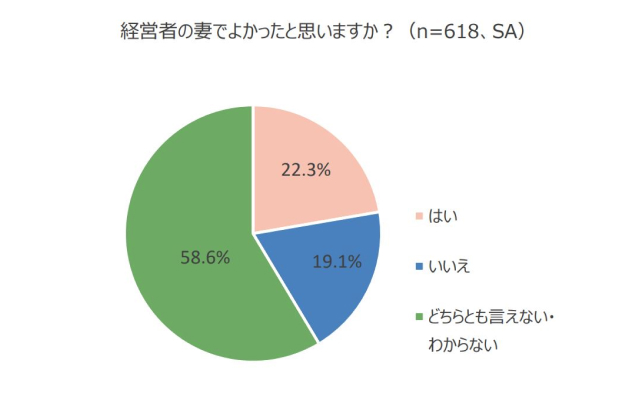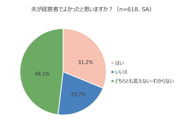 経営者の妻618名に、夫が経営者でよかったか聞いたところ、「はい」31.2%、「いいえ」20.7%、「どちらとも言えない・わからない」48.1%という結果でした。