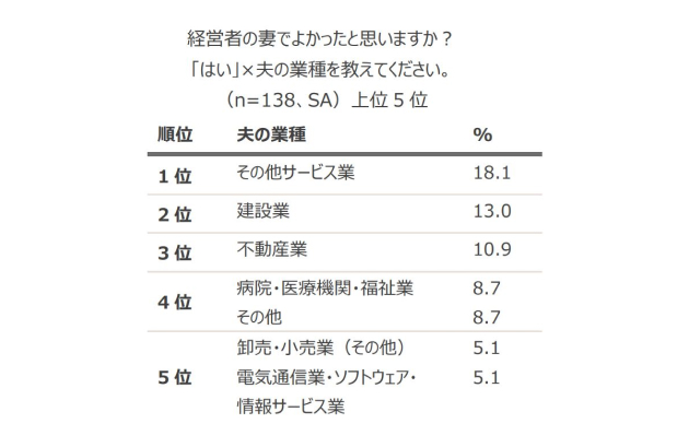 - 経営者の妻でよかったと思っているのは約2割(22.3%)、夫の会社の業種は「サービス業」(18.1%)が1位