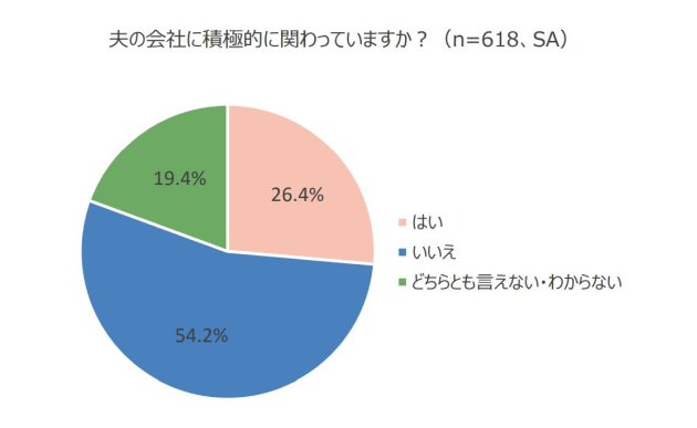 経営者の妻618名に、夫の会社に積極的に関わっているか聞いたところ、「はい」26.4%、「いいえ」54.2%、「どちらとも言えない・わからない」19.4%という結果でした。半数以上(54.2%)の経営者の妻は、夫の会社に積極的には関わっていないことが分かりました。
