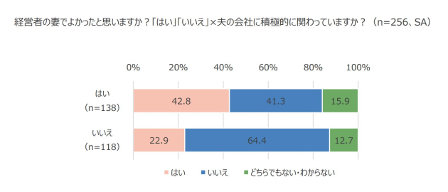 ただ、「経営者の妻でよかった」と回答した138名の妻は、同質問に「はい」42.8%だったのに対して、「経営者の妻でよくなかった」と回答した118人名の妻は、同質問に「はい」22.9%でした。
